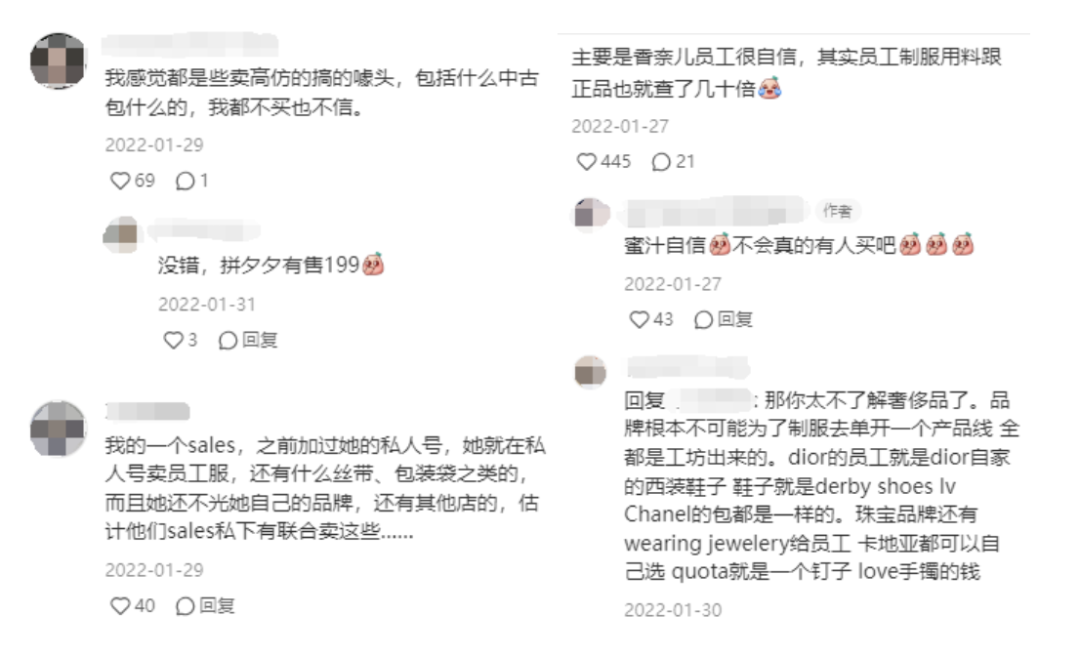當(dāng)然,針對(duì)奢侈品工服的爭(zhēng)議也不少。真假問(wèn)題首當(dāng)其沖,有人覺(jué)得是“賣高仿的在搞噱頭”,也有人說(shuō)自己認(rèn)識(shí)的柜姐就在賣;其次是質(zhì)量問(wèn)題,有人說(shuō)員工制服跟正品根本不能比,也有人說(shuō)“品牌根本不可能為了工服單開(kāi)產(chǎn)品線”。