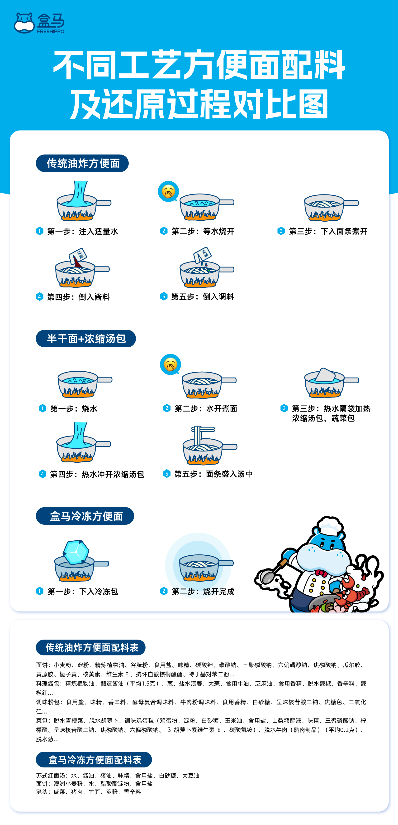 這一整套工藝包含了近20項(xiàng)國(guó)家專利技術(shù),最終讓盒馬的冷凍方便面既可以做到澆頭、面條、湯底“三材一體”,產(chǎn)品本身的配料表也更加干凈,所用的調(diào)料、香辛料也均為家庭廚房中常見的調(diào)味品。