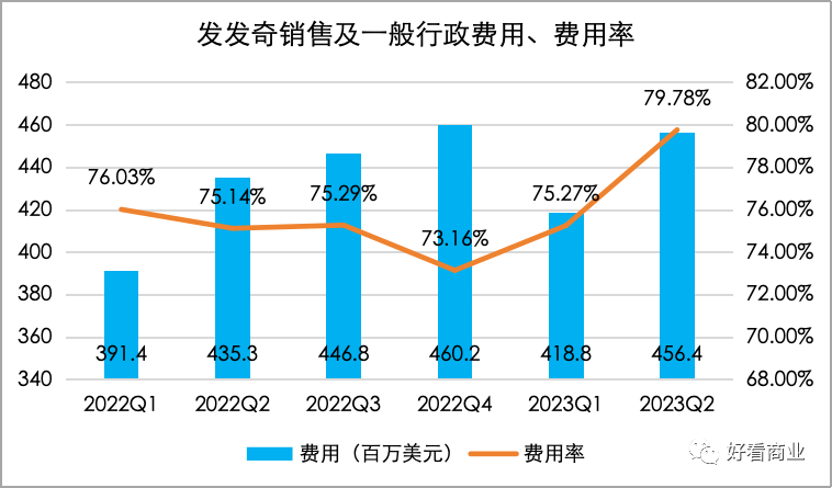 品牌業(yè)務(wù)和線下店的擴(kuò)張,還增加了Farfetch的運(yùn)營成本。2022年以來,F(xiàn)arfetch銷售費(fèi)用和人員規(guī)模都因新業(yè)務(wù)擴(kuò)張而快速增加,銷售及一般行政費(fèi)用率保持在75%左右的高位。