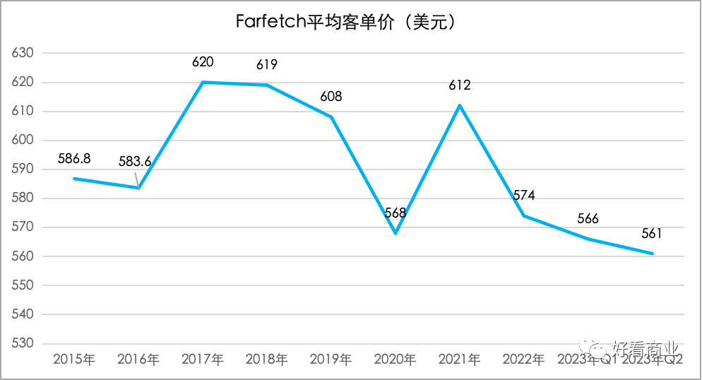 不僅活躍用戶數(shù)增速放緩,用戶在Farfetch花錢也越來越少。Farfetch的平均客單價(jià)從2021年的612元一路下滑,到今年Q2時(shí)已降至歷史低點(diǎn)——561美元,較2021年降超8%。
