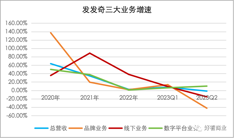 數(shù)字平臺業(yè)務(wù)在Farfetch總GMV中占比仍然接近90%。不僅如此,自2022年以來,F(xiàn)arfetch品牌業(yè)務(wù)和線下業(yè)務(wù)的增速明顯下滑。今年Q2,F(xiàn)arfetch營收同比降1.3%;其中品牌業(yè)務(wù)和線下業(yè)務(wù)營收同比分別下滑42%和15%。