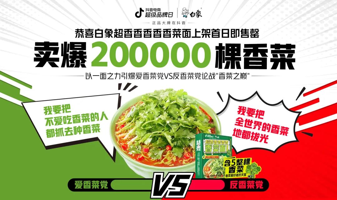 5 月,白象通過抖音的流量數(shù)據(jù)大盤,發(fā)現(xiàn)抖音上香菜相關(guān)話題有著 40 億的流量,但當(dāng)時(shí)市面上并沒有香菜口味的方便面來滿足這部分流量的需求。于是,白象與抖音合作,迅速打造出了香菜方便面,在抖音實(shí)現(xiàn)話題引爆。