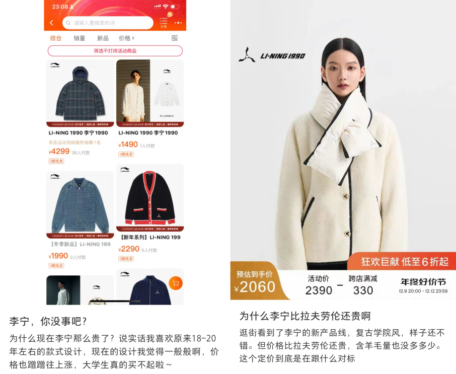 在小紅書上,年輕消費者、大學(xué)生都對LI-NING 1990的價格感到“疑惑”,一位用戶發(fā)帖評價道:“價格比拉夫勞倫還貴,含羊毛量也沒多多少”;也不乏用戶表示,更喜歡2018~2020年間的款式,LI-NING 1990的設(shè)計很一般,但是價格卻讓大學(xué)生買不起。