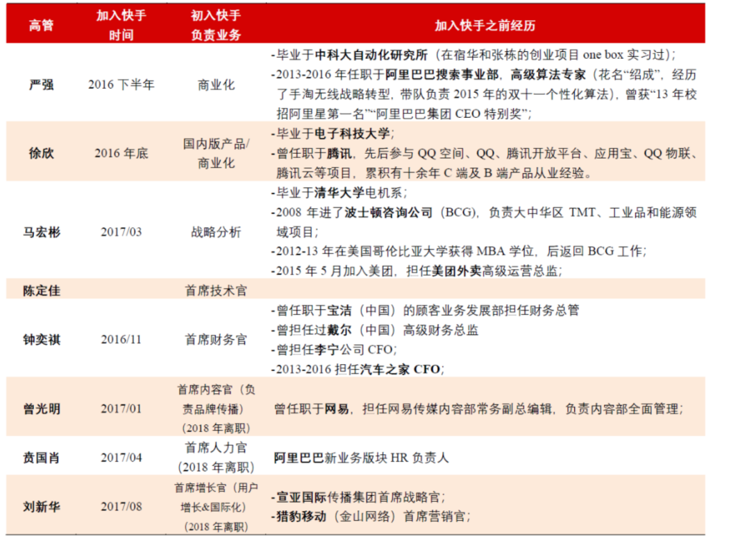 2016年下半年開始,快手陸續(xù)從阿里、美團、騰訊、網(wǎng)易等互聯(lián)網(wǎng)大廠的手里引進眾多高管,包括后來的CFO鐘奕祺,商業(yè)化負責(zé)人馬宏彬等人均是在這一時期加入到了這個新組建的“CXO職業(yè)經(jīng)理人”團隊。