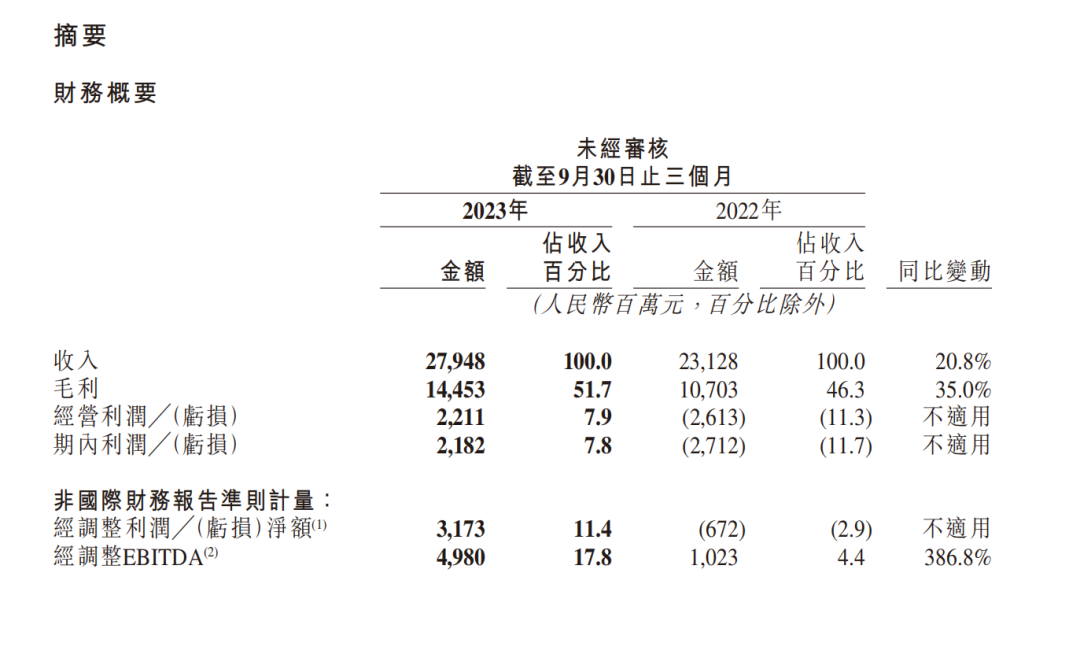 組織上的輕盈和轉(zhuǎn)向也反映到了業(yè)績上,2023年第一季度,快手實現(xiàn)調(diào)整后凈利潤4200萬,同比轉(zhuǎn)虧為盈,首次實現(xiàn)上市后的集團層面整體盈利,到第三季度,快手實現(xiàn)總營收為279.48億元,同比增長20.8%;經(jīng)調(diào)整凈利潤達31.7億元,較第二季度環(huán)比增長17.8%,超出市場預(yù)期。連續(xù)三個季度取得盈利,快手終于駛?cè)肓擞目燔嚨馈?/p>