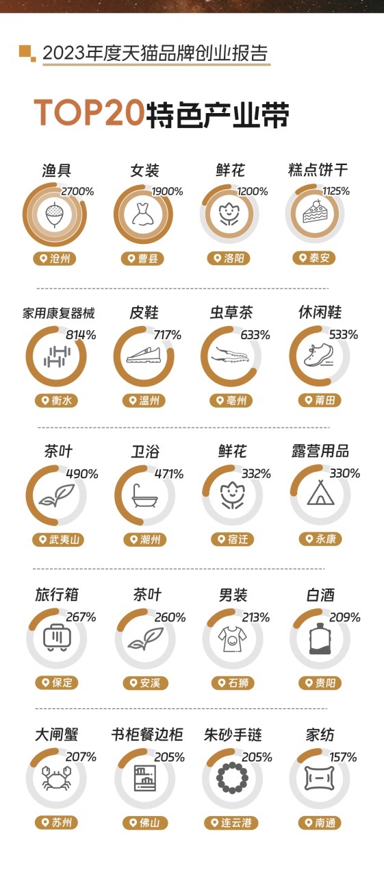 從品牌創(chuàng)業(yè)的商家類型上來看,最多的為特色產(chǎn)業(yè)帶工廠來天貓創(chuàng)立自有品牌,占比達(dá)41%,其次是為滿足新需求創(chuàng)立的新消費(fèi)品牌占比19%,此外為內(nèi)容型IP、直播紅人等創(chuàng)牌。在2023年創(chuàng)牌增速最快的TOP20特色產(chǎn)業(yè)帶中,滄州漁具、曹縣女裝、洛陽(yáng)鮮花、泰安糕點(diǎn)餅干新開店數(shù)增長(zhǎng)最快,增速均達(dá)1000%以上。
