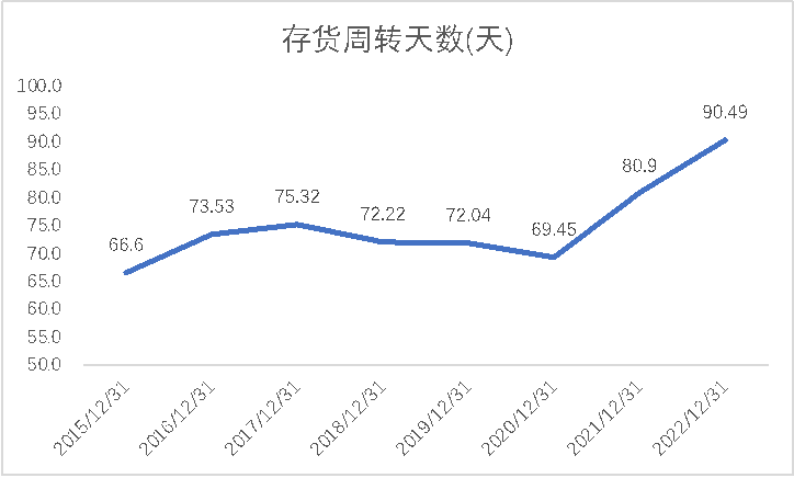 財(cái)報(bào)數(shù)據(jù)顯示,紅旗連鎖2022年的存貨周轉(zhuǎn)天數(shù)由2021年的81天上升到90.5天,超過了許多同行。在零售行業(yè),存貨周轉(zhuǎn)天數(shù)過長,意味著企業(yè)庫存積壓嚴(yán)重,可能出現(xiàn)商品過期、降價(jià)促銷等情況,使得企業(yè)經(jīng)營成本提高,經(jīng)營風(fēng)險(xiǎn)增大。