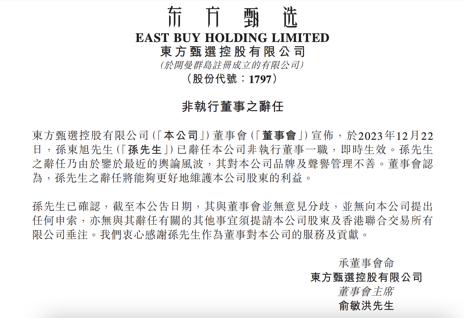 東方甄選表示 ,辭任孫東旭是因鑒于最近的輿論風(fēng)波,其對(duì)本公司品牌及聲譽(yù)管理不善。董事會(huì)認(rèn)為,孫東旭之辭任將能夠更好地維護(hù)本公司股東的利益。