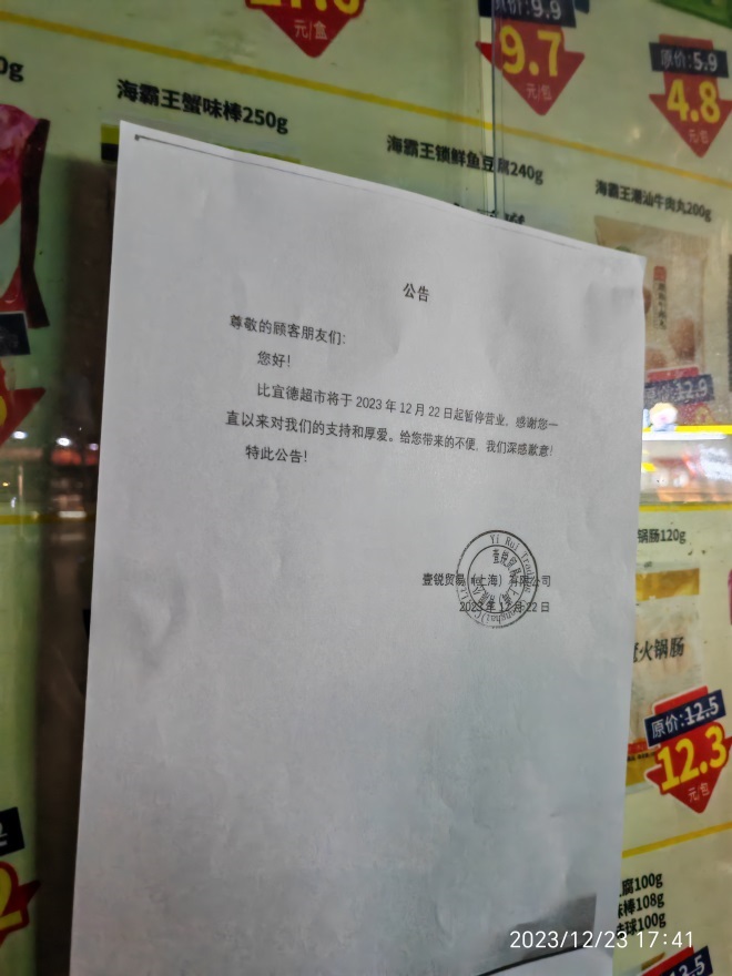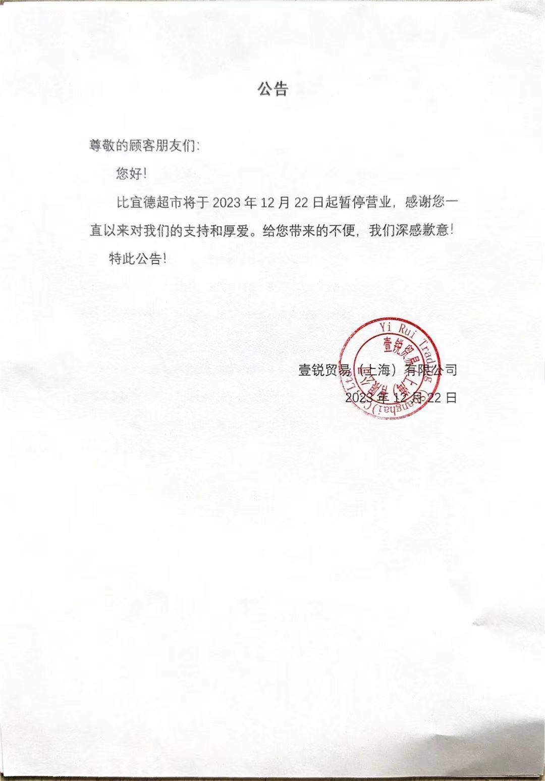12月23日消息,比宜德超市發(fā)布公告稱于2023年12月22日暫停營業(yè),毫無征兆,也暫無原因。