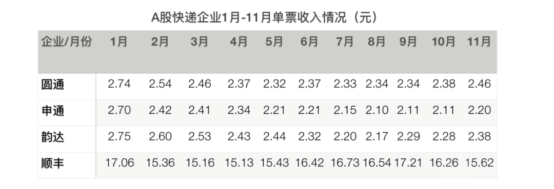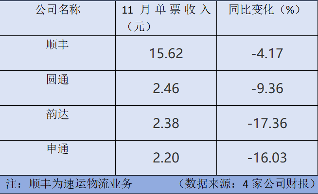從單票收入來看,順豐控股的11月單票收入為15.62元/件,韻達股份、圓通速遞及申通快遞的單票收入均在2元/件至3元/件這個區(qū)間。