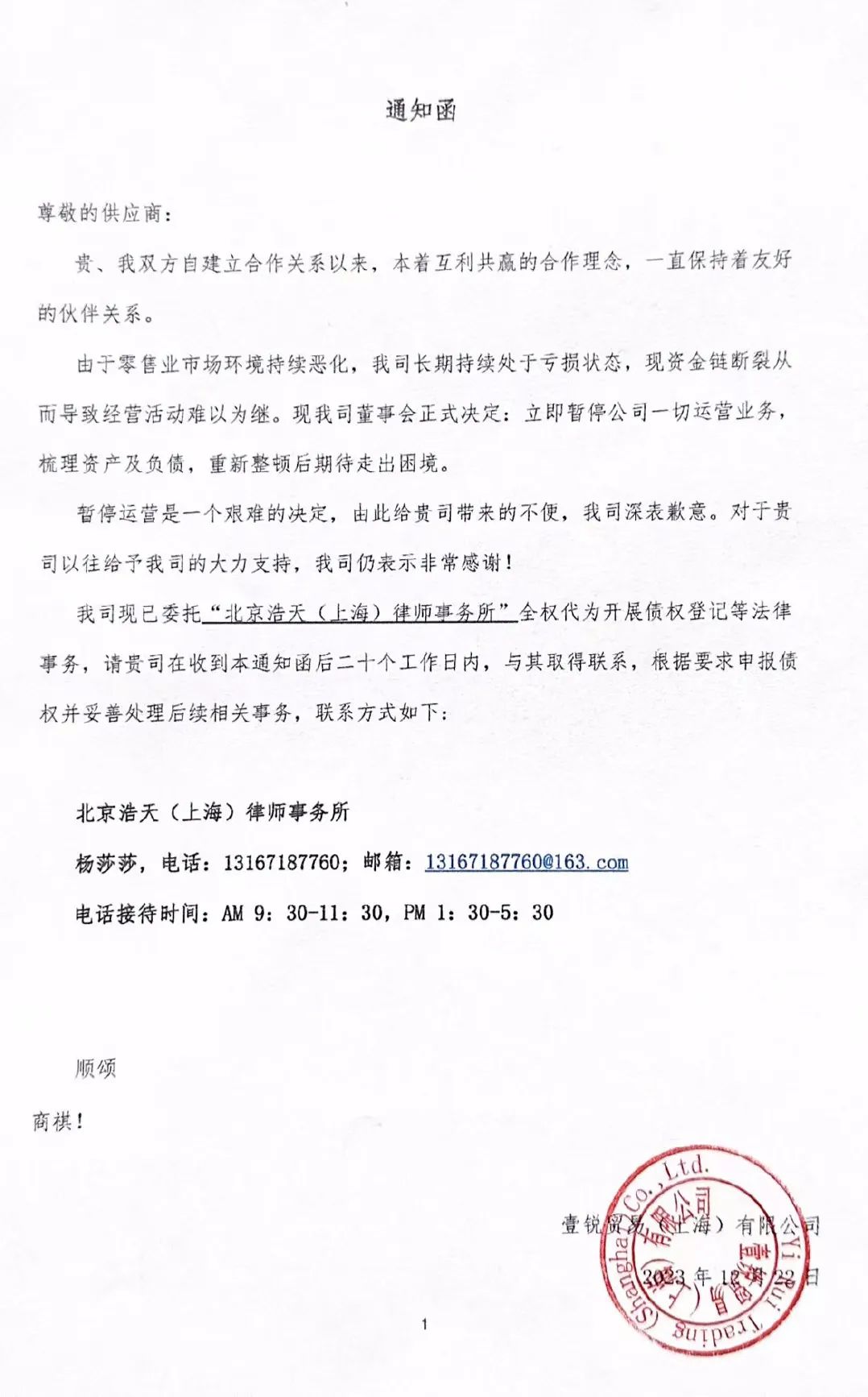 一份供應(yīng)商《通知函》里,比宜德運(yùn)營(yíng)公司壹銳貿(mào)易(上海)有限公司坦承停業(yè)原因是:零售環(huán)境持續(xù)惡化,長(zhǎng)期虧損,資金鏈斷裂,導(dǎo)致經(jīng)營(yíng)活動(dòng)難以為繼。