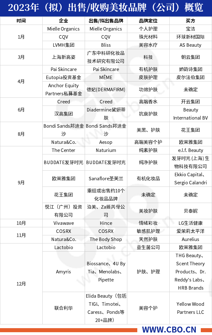 1月,LVMH集團(tuán)旗下私募基金L Catterton將旗下美容水療品牌Bliss出售。4月,私募基金Anchor Equity Partners計(jì)劃出售韓國品牌德妃(DERMAFIRM)。9月,聯(lián)合利華新CEO上任,大動(dòng)作精簡個(gè)護(hù)業(yè)務(wù),同月,花王宣布計(jì)劃出售旗下10個(gè)化妝品品牌。10月,寶潔考慮出售沙宣中國業(yè)務(wù)部分或全部股權(quán)的消息傳出;歐萊雅集團(tuán)出售旗下有機(jī)護(hù)膚品牌Sanaflore圣芙蘭并宣布將關(guān)閉法國水療美容品牌Decléor……