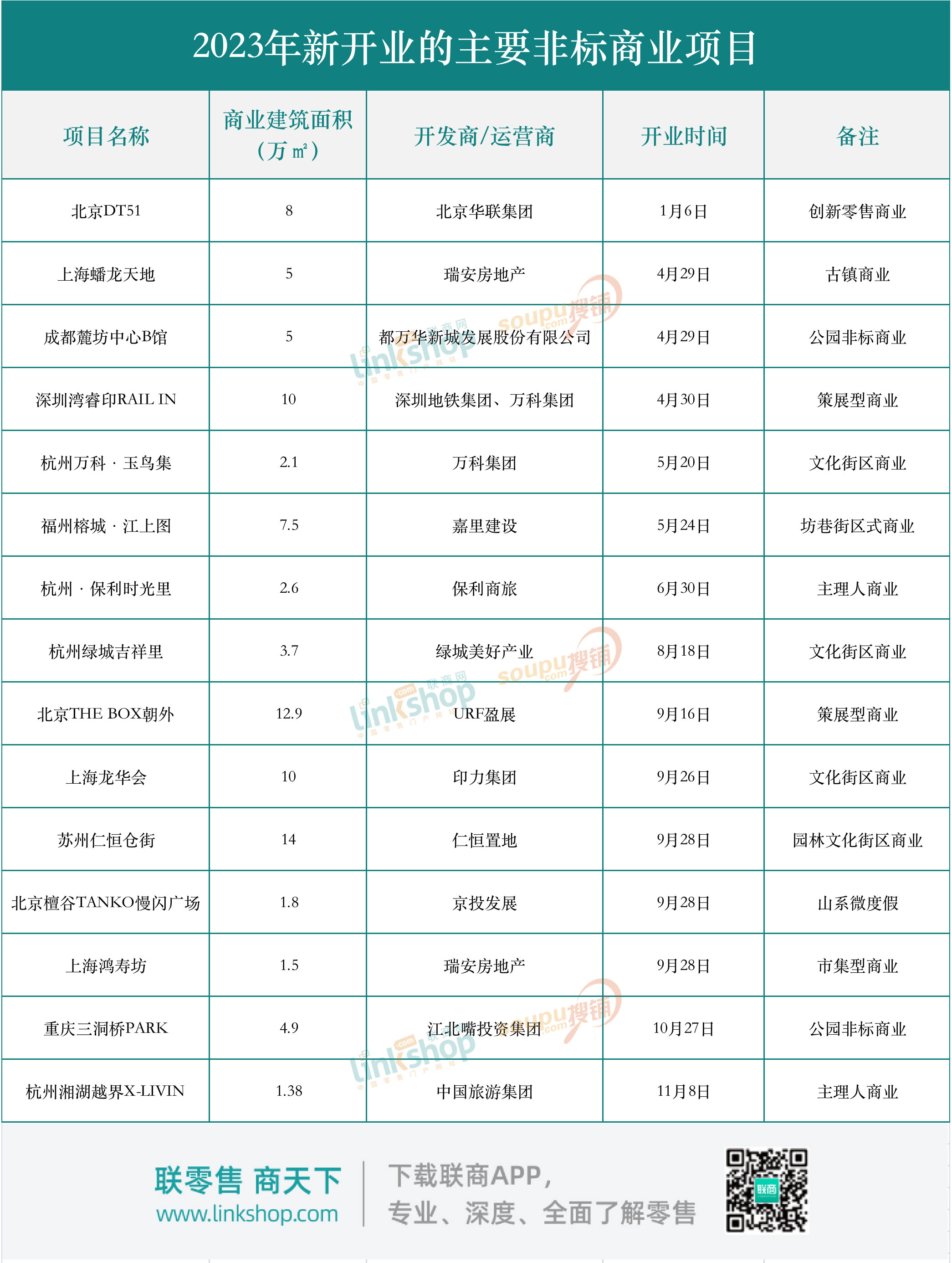 這點(diǎn),從我們統(tǒng)計(jì)的2023年新開業(yè)的主要非標(biāo)商業(yè)項(xiàng)目情況可以看出。
