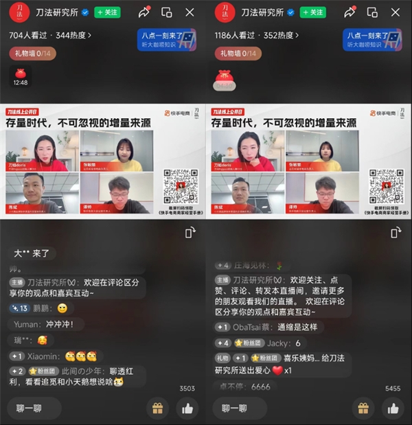近期,刀法研究所發(fā)起《存量時代,不可忽視的增量來源》線上公開日直播論壇,由其創(chuàng)始人兼CEO刀姐邀請快手電商大促運營負責人譚帥、小天鵝品牌快手渠道內容營銷負責人陳斌、追覓新媒體電商負責人張敏麗,共同探討品牌在快手上的增量價值。