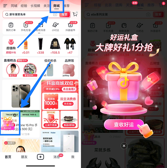 2023年12月20日~12月31日,打開(kāi)抖音APP首頁(yè)(升級(jí)最新版抖音APP),進(jìn)入“商城”入口,點(diǎn)擊左下角“好運(yùn)禮盒”掛件,點(diǎn)擊“立即開(kāi)抽”,即可參與“2024好運(yùn)請(qǐng)查收”活動(dòng)。
