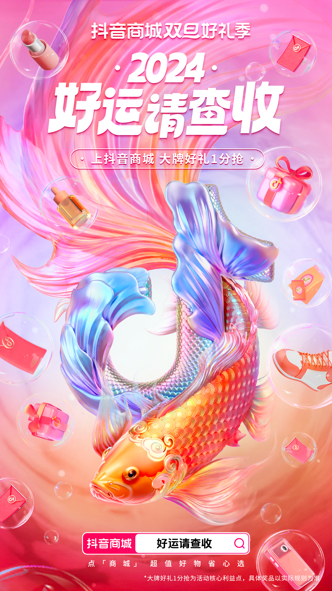 抖音商城來(lái)送好運(yùn)了,“雙旦錦鯉大禮包”驚喜來(lái)襲!12月20日-12月31日,「抖音商城雙旦好禮季」開(kāi)啟“2024好運(yùn)請(qǐng)查收”活動(dòng),攜手50多家品牌帶來(lái)抖音商城雙旦錦鯉大禮包,每個(gè)人都有機(jī)會(huì)1分錢(qián)抽取抖音商城雙旦錦鯉大禮包(內(nèi)含手機(jī)家電、服飾鞋包、美妝日化、親子寵物、食品健康、家居日百等大牌爆款好禮)。