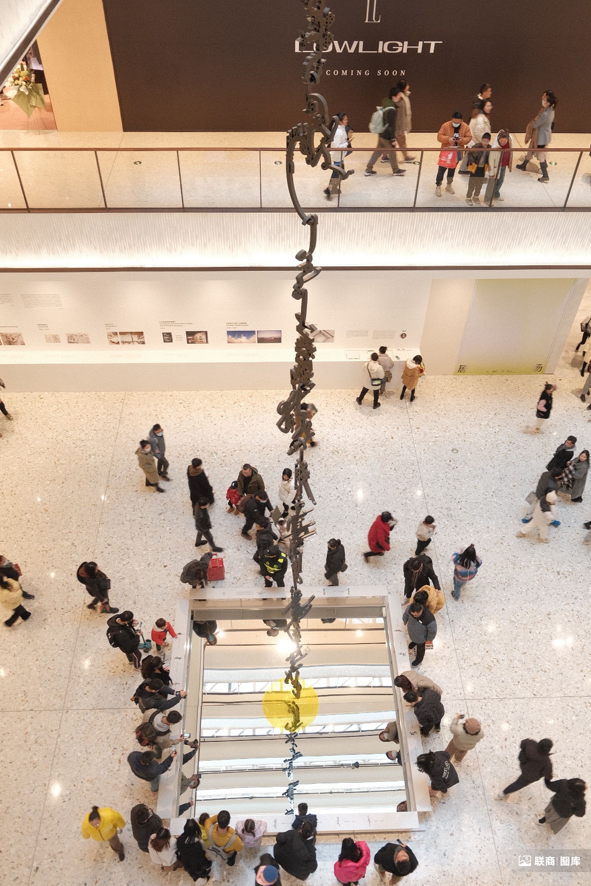 一樓中庭貫穿商場其中的《猴子撈月》裝置,將21個不同語言里字義為“猴”的文字象形化,雖然不太懂,但圍觀的人確實很多;