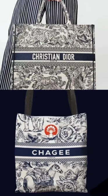去年五周年之際,霸王茶姬以云南茶馬古道為靈感,推出了全新包裝設計。只是這樣式多少有點眼熟。尤其是包袋款,從版式到插畫風格都與DIOR的經典包如出一轍。