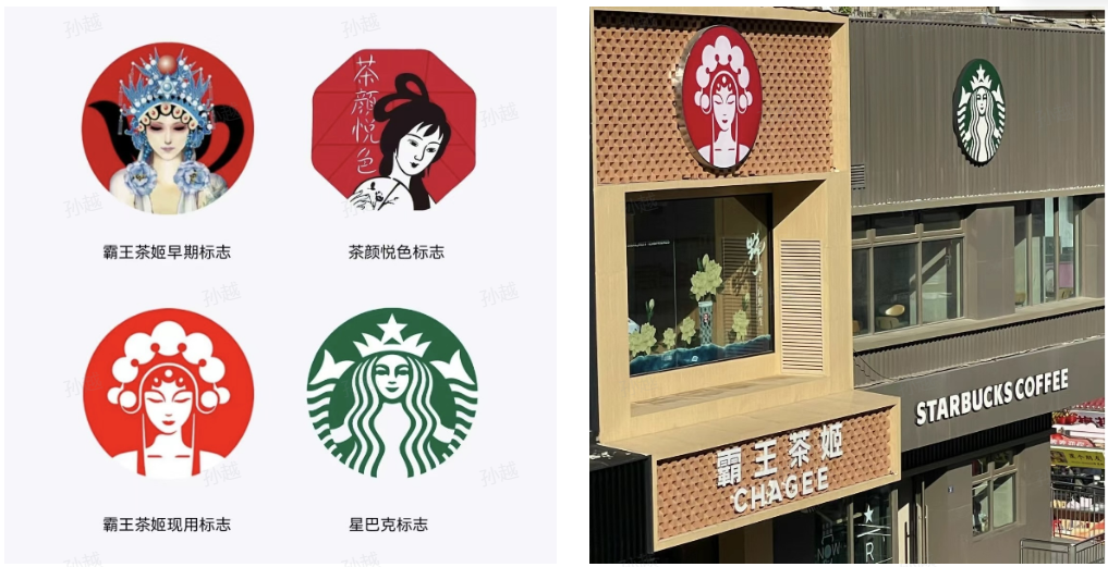 品牌調性上,霸王茶姬與茶顏悅色“不謀而合”的都使用了新中式風格。品牌logo、產品名稱以及門店設計上,霸王茶姬也是亦步亦趨。品牌升級后,霸王茶姬換用了“簡單配色+強視覺沖擊力”模式的logo,與星巴克“殊途同歸”。
