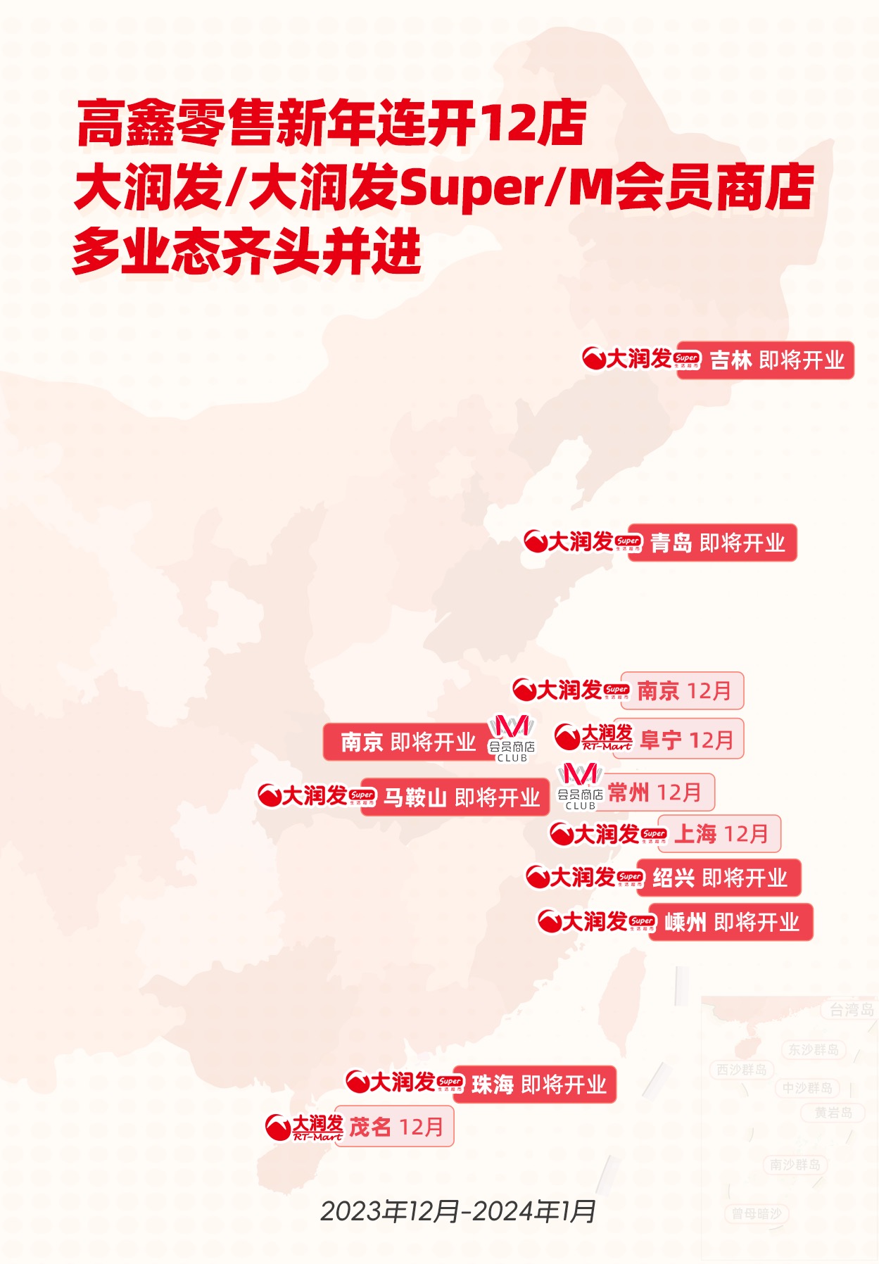 據(jù)悉,從2023年12月底到2024年1月,高鑫零售將在上海、南京、吉林、珠海、青島、常州、阜寧、茂名、紹興、馬鞍山、嵊州全國(guó)11個(gè)城市接連開(kāi)出12家新店,涵蓋大潤(rùn)發(fā)、大潤(rùn)發(fā)Super、M會(huì)員商店三個(gè)業(yè)態(tài)。
