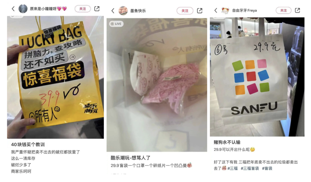 同行的朋友除了略顯羨慕以外,和我感慨自己在三福糾結(jié)半天花了29.9元買的福袋里只有兩個非常刺鼻難聞的香薰。本來以為能貪到點(diǎn)小便宜,結(jié)果拿回家拆開只能放衛(wèi)生間,還被親媽嫌棄說是“毒氣彈”,“我敢打賭,絕對是賣不出去的庫存貨,結(jié)果被我這個大冤種給買了”。