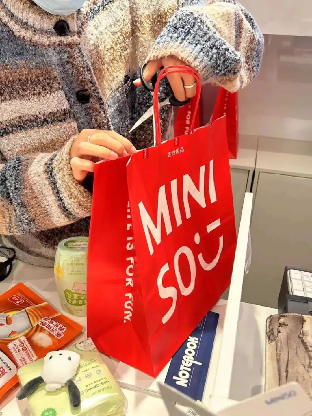 名創(chuàng)優(yōu)品這波限量100萬份的活動一上線,就擺在了店內(nèi)結(jié)賬最扎眼的位置。鮮亮的超大紅色購物袋被密封好依次排開,每當(dāng)有人結(jié)賬買了盲袋時(shí)都會引起周圍一圈小小的圍觀,“看看拆出來了啥?”、“媽呀這個好值”、“哈哈哈,他血虧”……