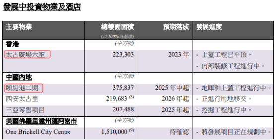 至于另一個導(dǎo)致公允值虧損的“發(fā)展中的辦公樓投資物業(yè)”,主要集中在太古廣場六座及頤堤港二期兩個項目,總樓面面積約40萬平方米。
