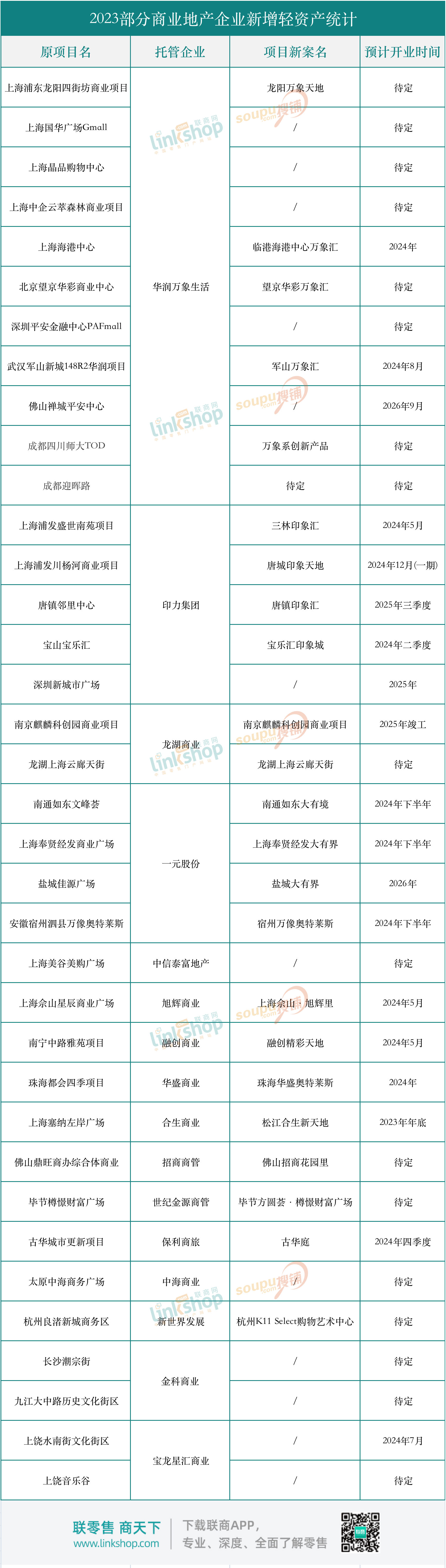據(jù)聯(lián)商網(wǎng)不完全統(tǒng)計(jì),2023年華潤(rùn)萬象生活、印力集團(tuán)、招商商管、一元股份、旭輝商業(yè)、龍湖商業(yè)、寶龍星匯商業(yè)、中海商業(yè)、中信泰富、融創(chuàng)商業(yè)、合生商業(yè)、保利商旅、金科商業(yè)、新世界發(fā)展、華盛商業(yè)等企業(yè)均新簽了輕資產(chǎn)商業(yè),總體數(shù)量大達(dá)36個(gè),其中存量改造項(xiàng)目就有8個(gè)。