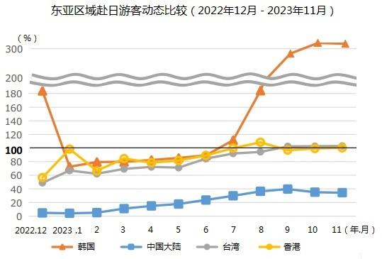 根據(jù)日本旅游觀光部門發(fā)布數(shù)據(jù),從2022年12月到2023年11月,東亞四個(gè)國家或地區(qū)赴日游客的活躍度,包括到訪人數(shù)、購買頻次,中國大陸排在最后,相當(dāng)于2019年同期的35%左右。雖然受到航班限行、管制措施較多、媒體誘導(dǎo)等因素影響,但是和2019年比較,下降幅度出乎意料。日本相關(guān)方對(duì)中國大陸游客消費(fèi)的預(yù)算期待,只能推遲到2024年。