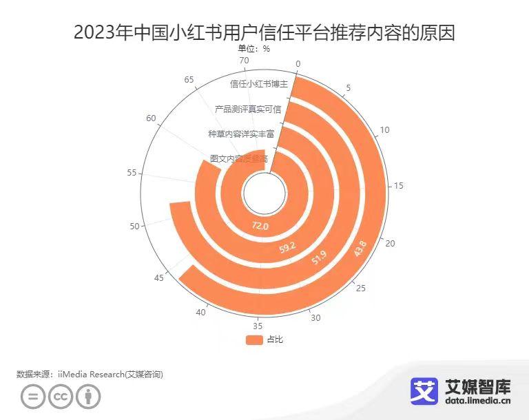 艾媒咨詢的數(shù)據(jù)顯示,2023 年中國小紅書用戶信任平臺推薦內(nèi)容的原因主要是圖文內(nèi)容質(zhì)量高(72.0%)、種草內(nèi)容詳實(shí)豐富(59.2%)、產(chǎn)品測評真實(shí)可信(51.9%)、信任小紅書博主(43.8%)。