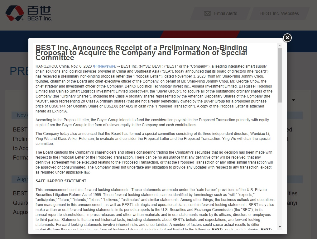 11月6日,百世集團(tuán)發(fā)布公告稱,公司董事會(huì)已接到初步非約束性私有化提案。該提案來自百世集團(tuán)創(chuàng)始人、董事長兼CEO周韶寧,公司首席戰(zhàn)略和投資官周韶建,以及Alibaba Investment Limited(阿里)、Cainiao Smart Logistics Investment Limited(菜鳥)等組成的收購者聯(lián)盟(Buyer Group)。