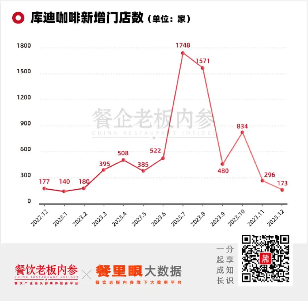 再結(jié)合最新的開店數(shù)來看,11月新增296家、12月新增173家,增速回歸到了品牌初創(chuàng)時期。雖說月均200+的新增門店數(shù)量,放眼整個餐飲界依舊很能打,但對于庫迪而言,“失速”就意味著“失控”。
