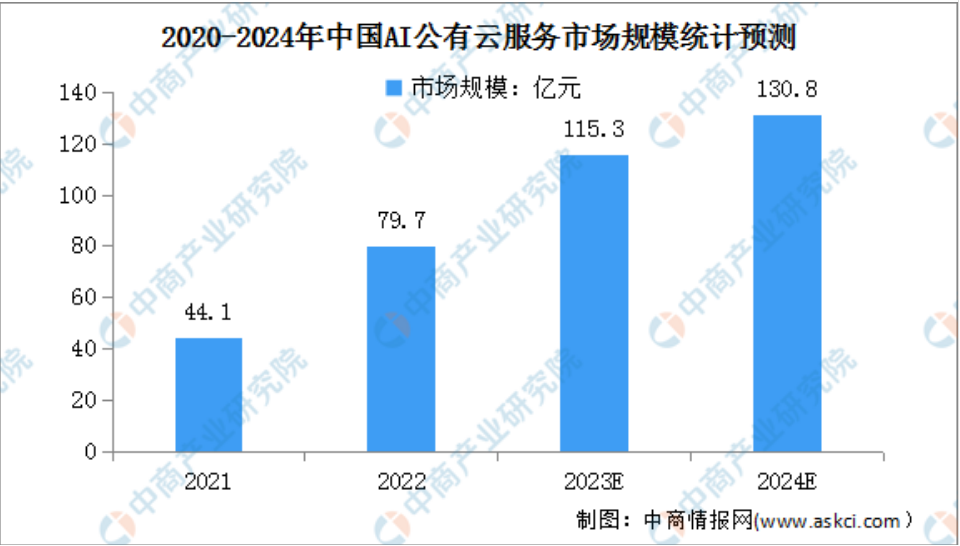 《2024-2029全球及中國公有云行業(yè)研究及十四五規(guī)劃分析報告》顯示,2022年中國AI公有云服務整體市場規(guī)模達79.7億元,同比增長80.6%。預計2023年AI公有云服務市場規(guī)模將進一步增長至115.3億元,2024年將達130.8億元。