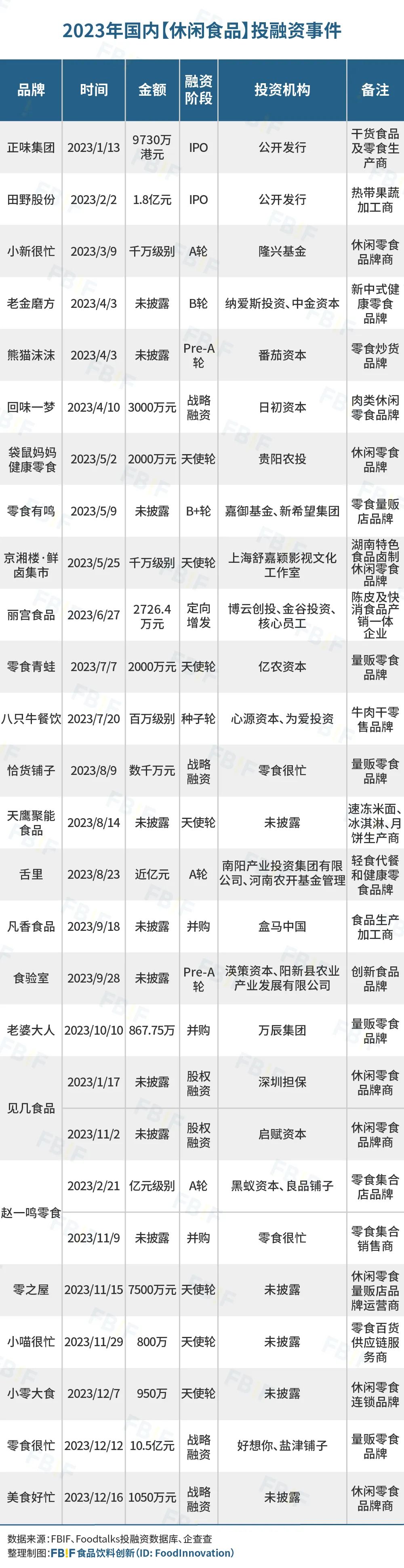 2023年,休閑零食品類共有26起融資事件,相比2022年為33起有所回落。其中,熱帶果蔬加工商田野股份和干貨食品及零食生產(chǎn)商正味食品在今年成功上市。