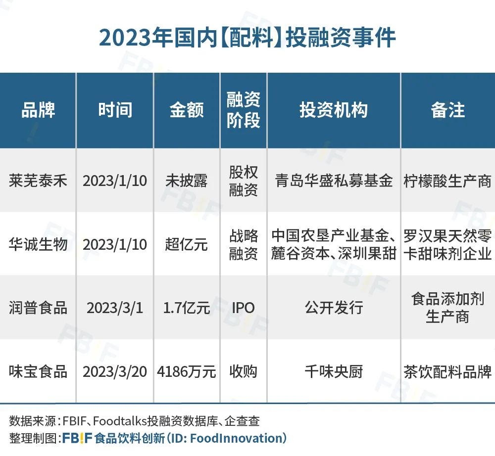 2023年,在配料品類上,有4家企業(yè)拿到新一輪融資,除了食品添加劑生產(chǎn)商潤普食品外,其余三家均與新茶飲賽道有關(guān)。