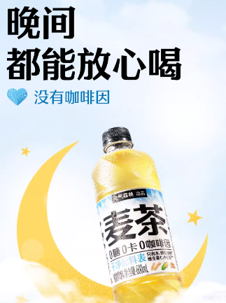 其實,麥茶的原料主要是大麥,本身并不含有咖啡因。但元氣森林依然將“0咖啡因”“早晚放心喝”作為賣點,并體現(xiàn)在了產(chǎn)品的宣傳海報中。畢竟,在無糖茶逐漸口糧化的趨勢下,既能讓消費者在睡前“喝一口茶”,又不影響睡一個好覺,也是一個新需求。