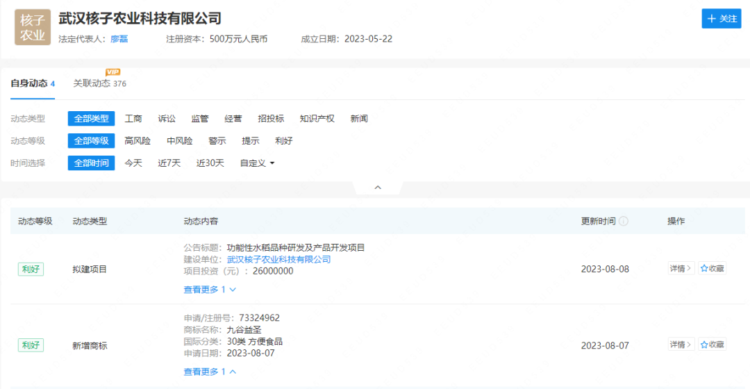 2023年8月,武漢核子農(nóng)業(yè)科技有限公司申請了一個名為“九谷益圣”的商標,分類為“方便食品”,涉及方便米飯、速凍食品等等。