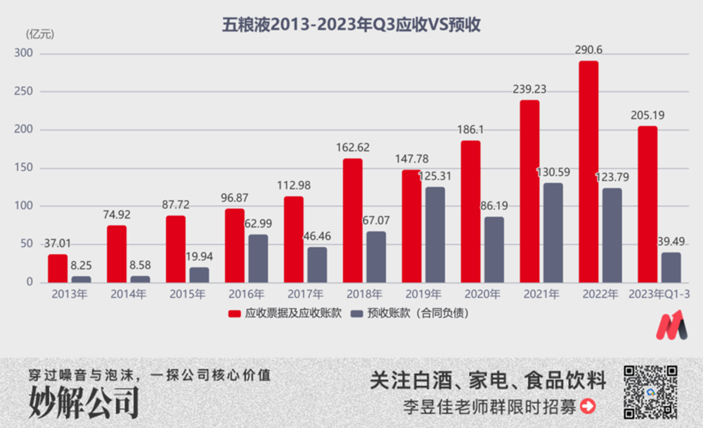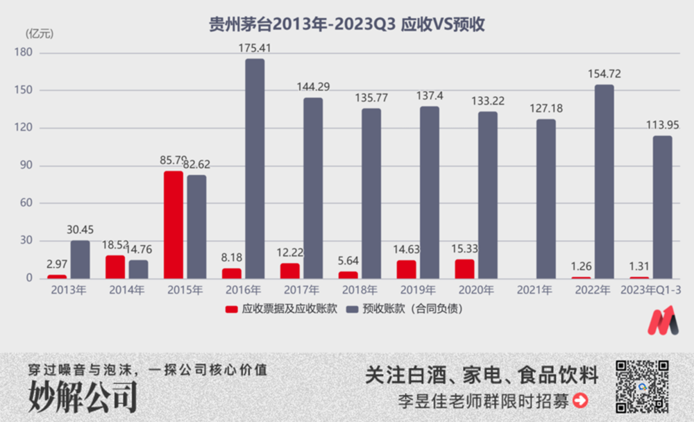 2022年,茅臺(tái)預(yù)收賬款高達(dá)154.72億元,應(yīng)收票據(jù)及賬款僅1.26億元,五糧液則正相反,應(yīng)收票據(jù)及賬款合計(jì)290.6億元,預(yù)收賬款123.79億元。2023前三季度,茅臺(tái)的預(yù)收款與應(yīng)收款差額為112.64億元,五糧液的則為-165.7億元。