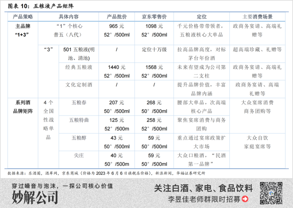 五糧液旗下白酒有兩大系列,一是主品牌五糧液系列,核心產(chǎn)品聚焦“1+3”,“1”即核心大單品52度普五(目前產(chǎn)品升級到第八代,也叫第八代五糧液),“3”指對標(biāo)茅臺(tái)年份酒的超高端501五糧液、對標(biāo)飛天茅臺(tái)的經(jīng)典五糧液以及針對區(qū)域市場的39度低度五糧液。