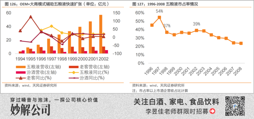 并且,五糧液充分利用經(jīng)銷商的資金、資源杠桿,經(jīng)銷商利用五糧液的品牌勢能獲得豐厚的渠道利潤,廠、商合力之下五糧液以低成本快速擴(kuò)張:1997年在上市酒企的市占率一度達(dá)到54%,此后多年也基本維持在近40%,成為當(dāng)時(shí)白酒行業(yè)的領(lǐng)頭羊。