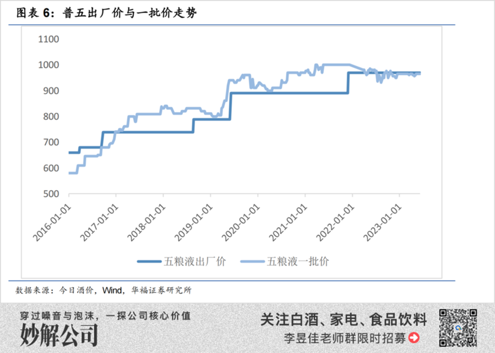 我們能看到,疫后商務(wù)活動(dòng)所需的高端白酒需求疲軟后,普五一批價(jià)一直徘徊在969元出廠價(jià)上下,最低時(shí)價(jià)格僅有940元/瓶。若此時(shí)跟隨茅臺(tái)提價(jià),可能會(huì)帶來對五糧液需求的抑制。