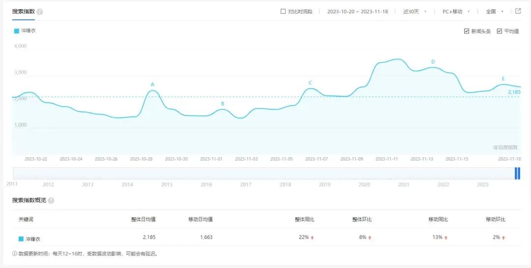 百度指數(shù)顯示,今年以來,沖鋒衣日均搜索指數(shù)超過了2180;新紅數(shù)據(jù)顯示,過去30天,#沖鋒衣#話題在小紅書總瀏覽量近2億,熱度超過93.41%的其他穿搭打扮相關(guān)詞。