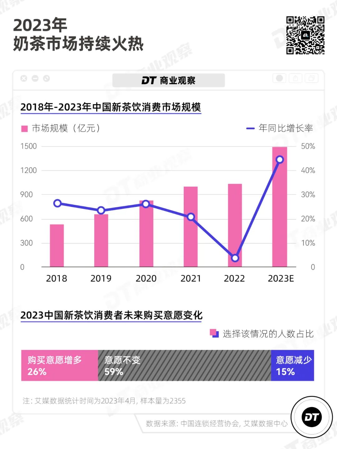 從行業(yè)來看,奶茶消費(fèi)市場規(guī)模在2023年同比上漲了44.3%。