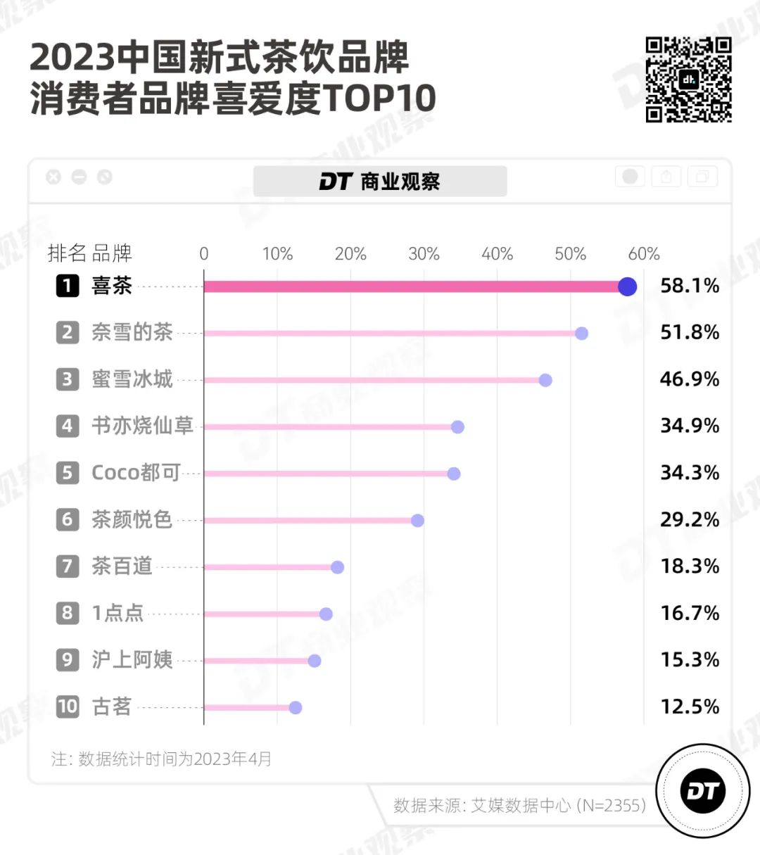 艾媒咨詢數(shù)據(jù)顯示,2023年新茶飲品牌消費(fèi)者喜愛度調(diào)研中,喜茶以58.1%得票率位居TOP1。