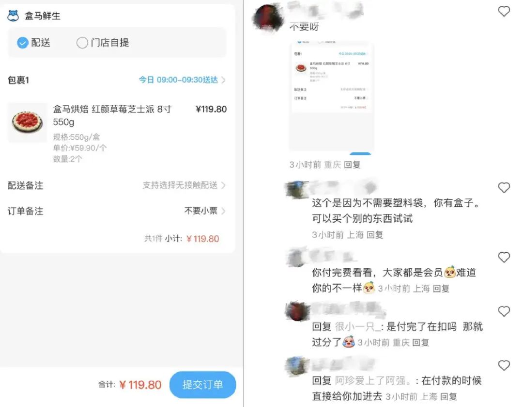 有的會員不得不安慰自己:好在還能省下6塊錢的高額配送費,轉頭盒馬就給了“線上更貴”和“袋子收費”兩個暴擊。