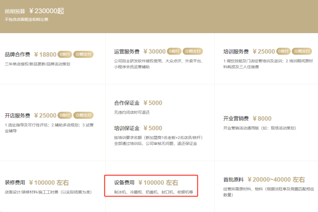 但一家新茶飲加盟店開業(yè)前,品牌方的這些設備售價卻極高。其中,喜茶加盟設備費15萬起,古茗設備10萬起。而且在商圈租賃中有一條不成文的“行規(guī)”,門店經營者退出前,必須將門店恢復到租賃前原有狀態(tài),這也意味著即使加盟商將這些設備全部變現(xiàn),有可能還需承擔額外的費用。