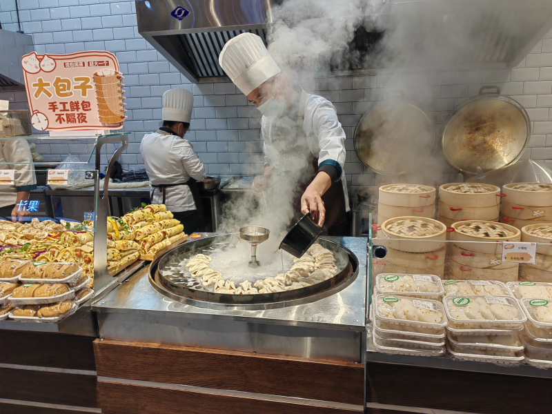 除此之外,新店重點(diǎn)打造鮮食加工部,以“一日三餐”為核心,在門店內(nèi)增加了現(xiàn)場制作的包子、饅頭,手工餛飩等早餐類目,現(xiàn)場“煙火氣”十足。針對年輕消費(fèi)者的飲食習(xí)慣和需求,店內(nèi)增加了輕食、拌菜區(qū)域,同時(shí)也提供新鮮鹵味、撈汁小海鮮等多個(gè)品類的即食小吃。