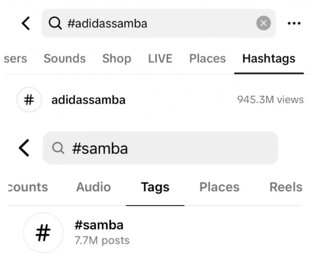 在TikTok上,#adidassamba的觀看次數(shù)已經(jīng)超過9.4億次,#samba話題在Instagram上的提及次數(shù)高達(dá)770萬次。