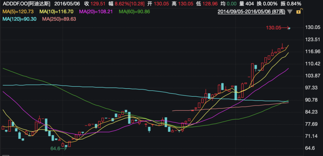阿迪達(dá)斯2016年第一季度銷售收入增長22%,毛利提高49.4%,股價(jià)攀升至130歐元,自2014年以來首次追平耐克。