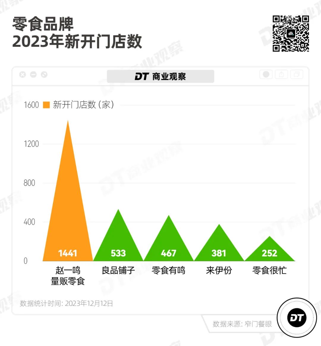 根據(jù)窄門餐眼數(shù)據(jù),起步于2019年的趙一鳴量販零食,光是在2023年,就開出了1441家門店,幾乎達到良品鋪子的三倍。